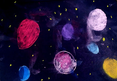 This was one of the favourite projects we did - pastels on black paper and looking at the light source from either the sun or moon to make the planets look like they were actually off in space.